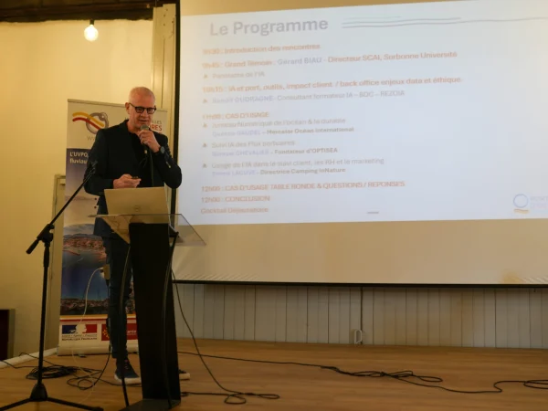 Benoit Dudragne, consultant idrezo, a présenté la situation actuelle des usages de l’IA dans les ports de plaisance d’Occitanie et a abordé la diversité de ses outils, ses impacts sur l’expérience client et le back-office, ainsi que les enjeux en terme de données numériques et d’éthique.